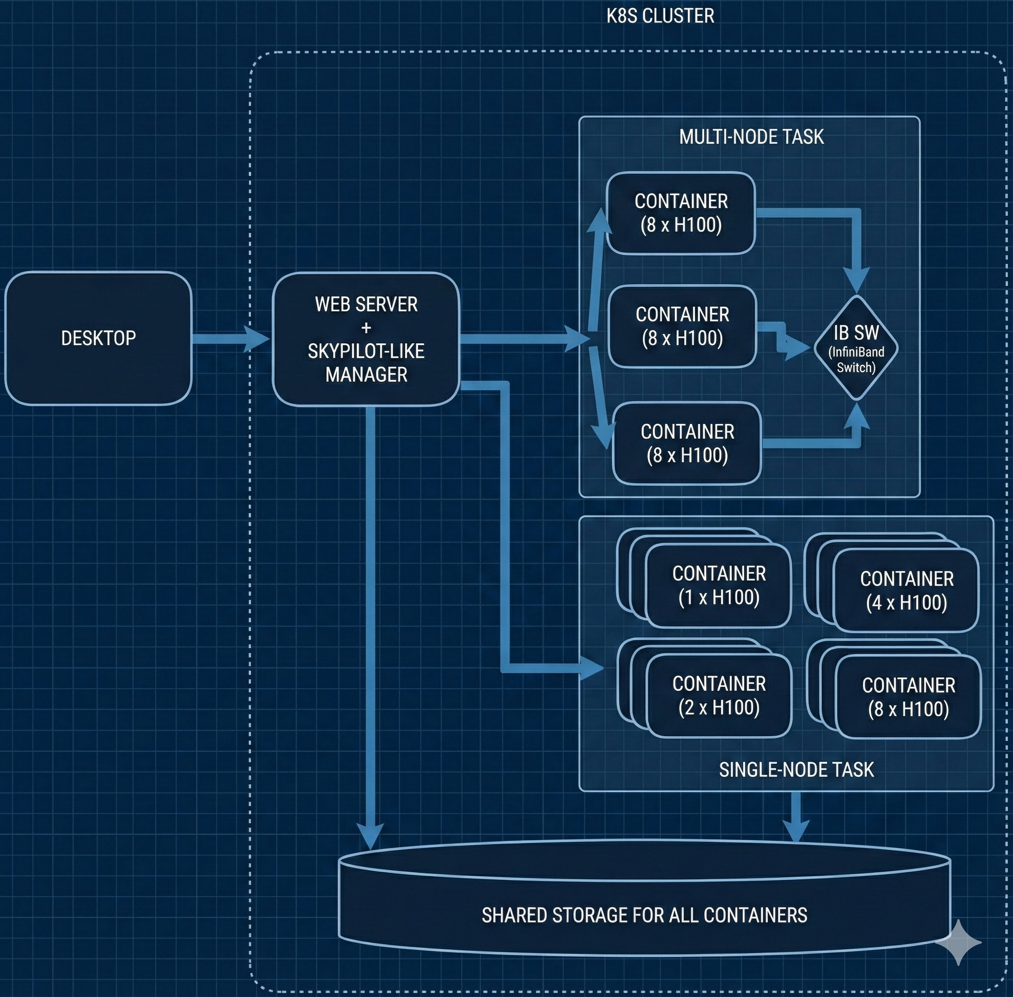 该架构通过应用层集群化 (Application-Layer Clustering) 技术,在异构且受限的 K8s 容器环境之上,构建了一套逻辑上的 HPC 集群。它解耦了底层基础设施管理(由 SSH 负责)与上层计算任务调度(由 Ray 负责),是处理 Verl/SkyRL 此类强耦合分布式应用的标准化解决方案。