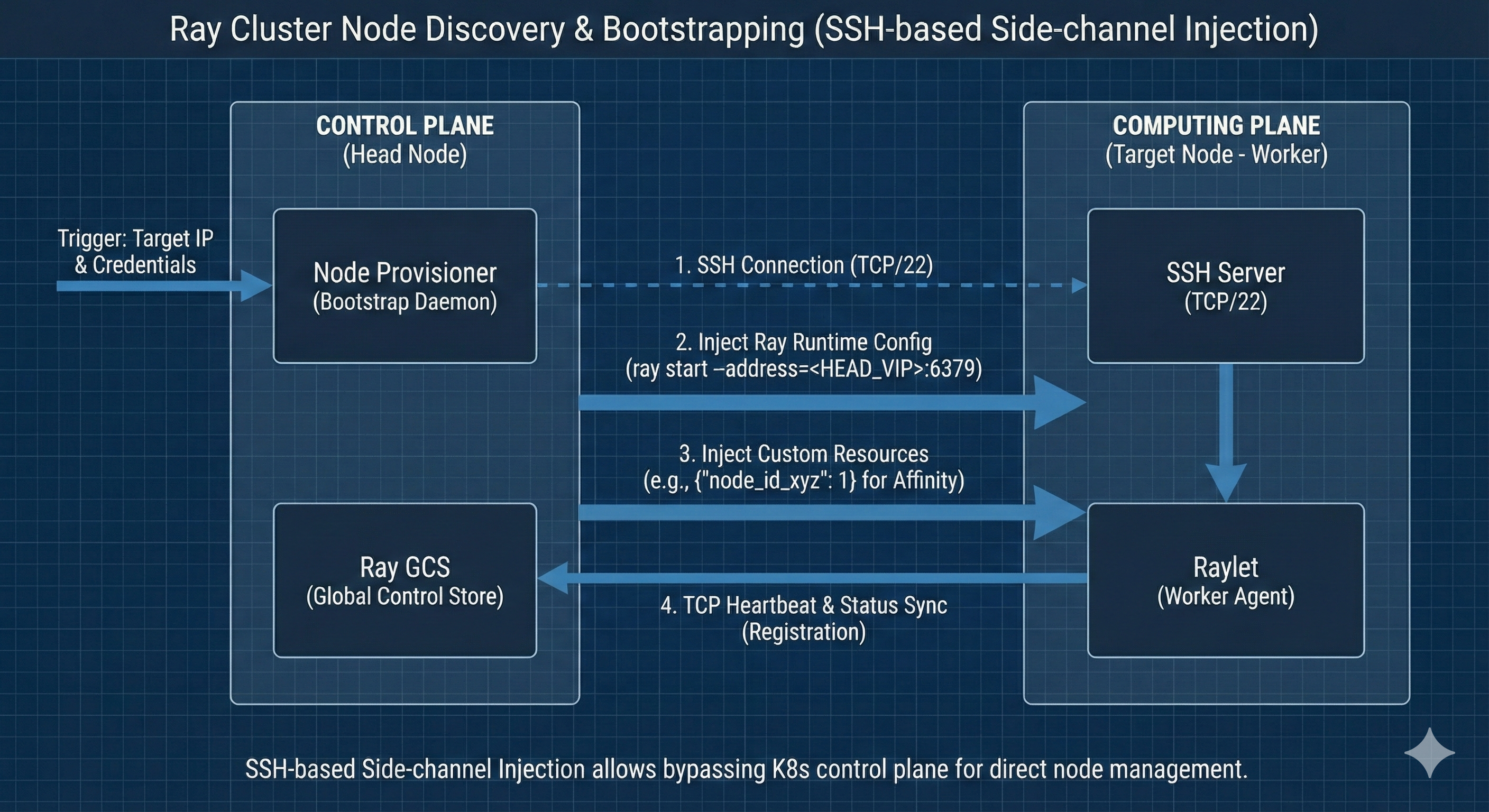 “中心化控制平面 + 分布式计算平面” 的架构设计。系统基于 Ray Cluster 构建应用层调度器,利用 SSH 作为带外(Out-of-Band)节点发现机制,并在底层通过 NFS 实现数据一致性。