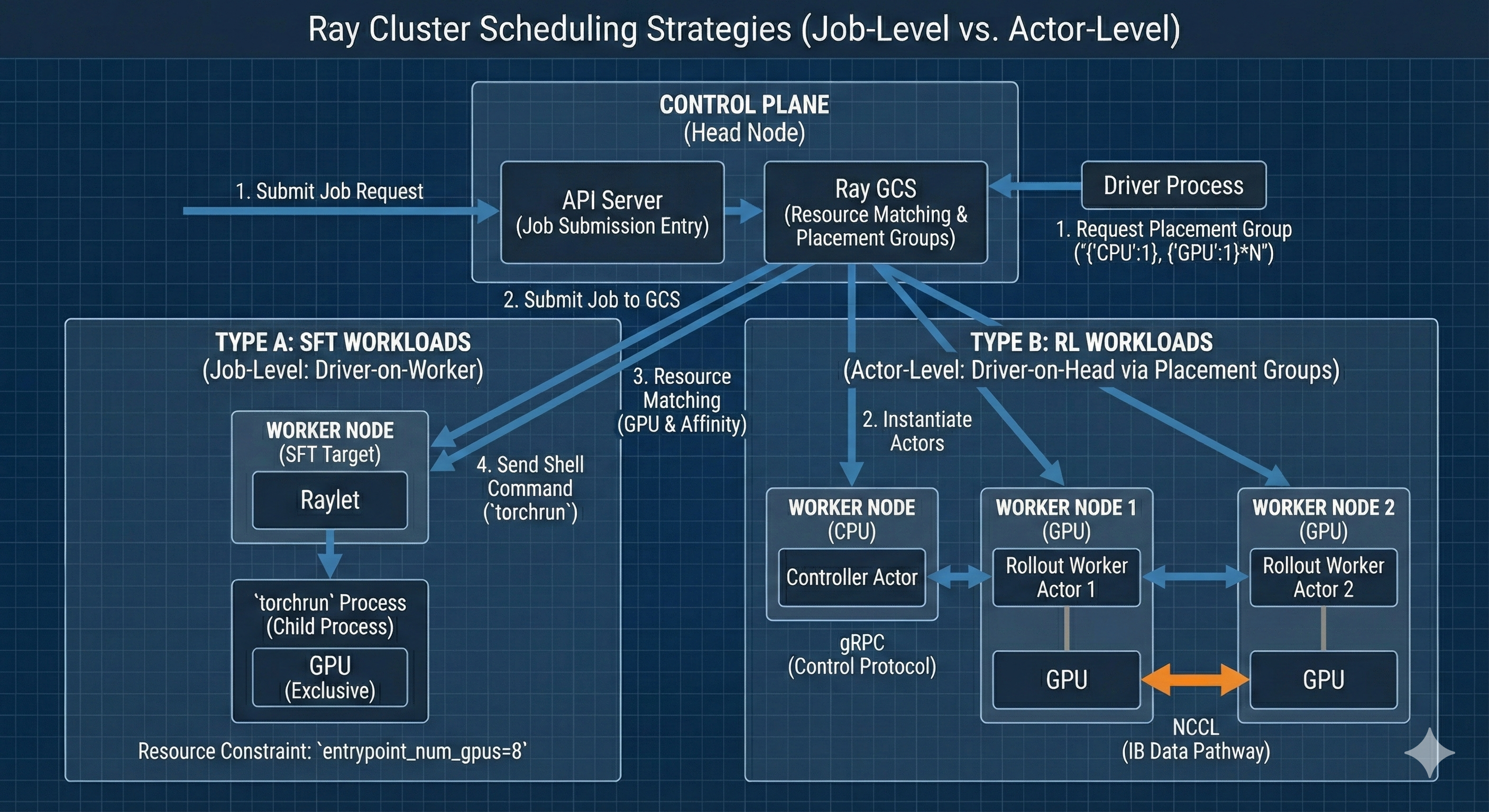 - 通信模型:Controller 与 Workers 通过 gRPC (Ray Protocol) 交换控制指令;Workers 之间通过 NCCL (IB) 交换 Tensor 数据。